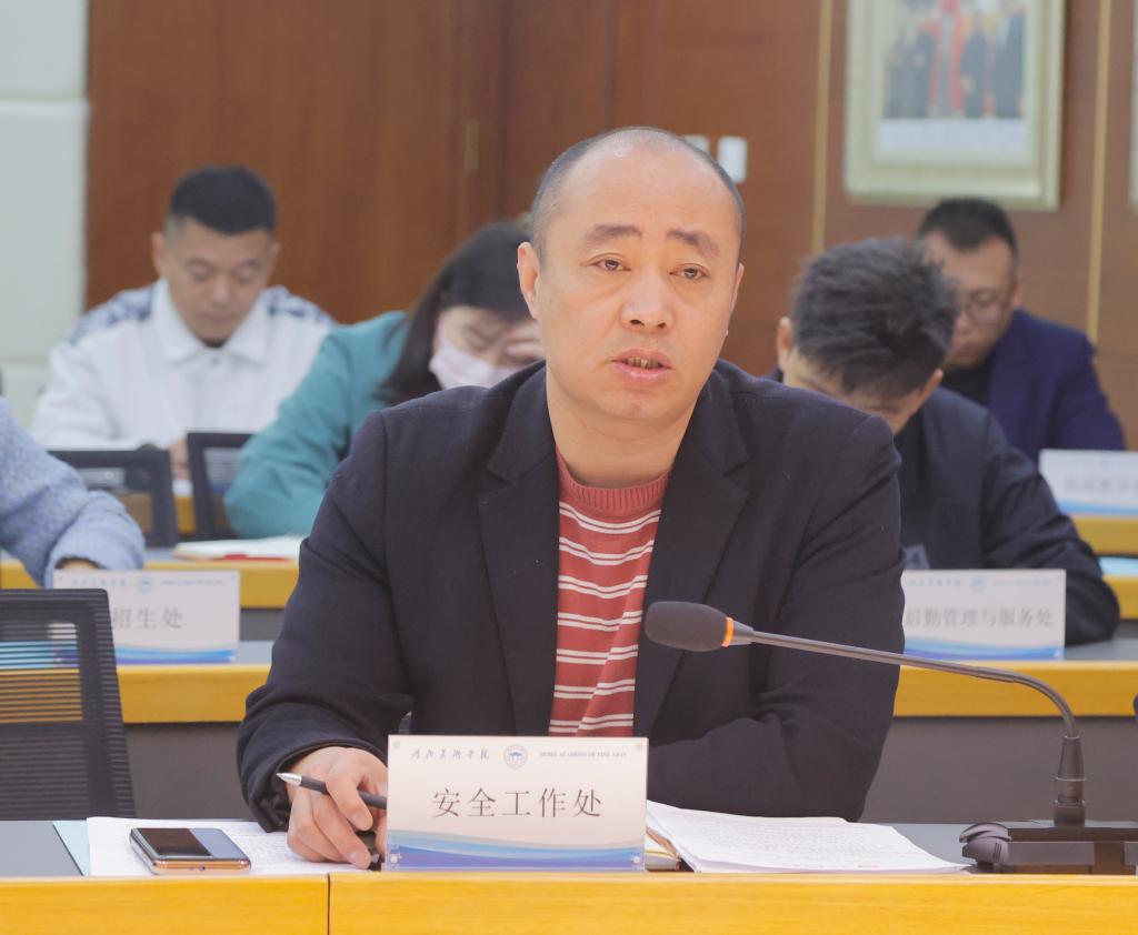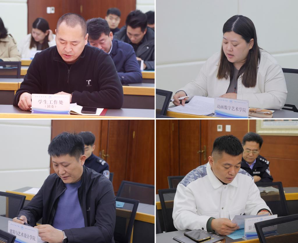 学生工作处、动画数字艺术学院、建筑与艺术设计学院、影视艺术学院作为代表对本部门安全稳定工作开展情况、形势分析、存在的问题进行发言。